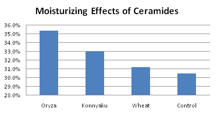 The moisturizing effect of ceramides was established by several clinical studies. These reports showed that ceramides were absorbed into the intestine, circulated into the stratum corneum, and worked to improve barrier and moisturizing function. The moisturizing effects of ORYZA CERAMIDE® were compared with other commercially available ceramides. ORYZA CERAMIDE®–P demonstrated superior moisturizing effect, with a moisture ratio of 35%.